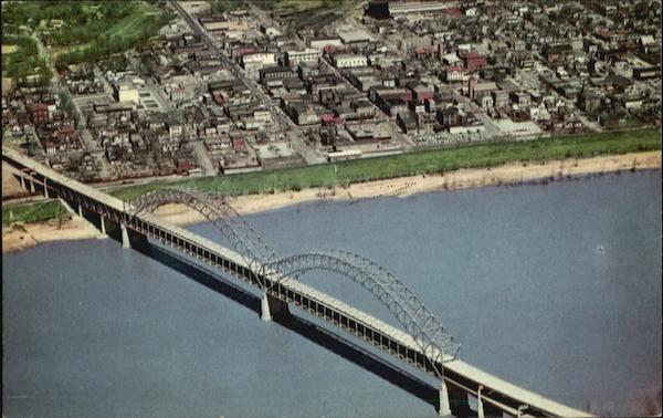 | Airview of the Ohio river Sherman Minton Bridge, and New Albany, Indiana. Completed in 1962, this beautiful double deck bridge across the mighty Ohio river connects New Albany, Indiana with Louisville, Kentucky, and is a vital Link in Interstate Highway System 1-64. |