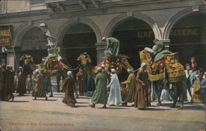 Front: NALE ARRAEION A TIS MA AYAR NIT Réunion d'une Circoncision arabe CAR ATTEFIE ΑΓΓΕΠΕ Back: The Cairo Postcard Trust, Cairo. 54701 Poste Egyptienne
