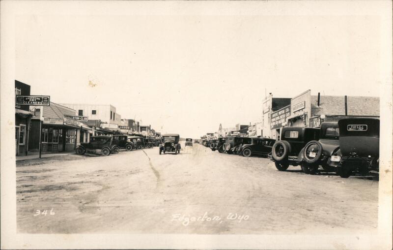 Front: TAILOR EDGERTON OUR DRY MADE CLOTHES CLEANERS WORK TAXS CLOTHES SOUS EDGERTON-CLUB SHOP HARDWARE DRUGS BRUGS WEVE MOTOR CO DONGE IS MOTOR CAPS 346 Edgerton, Wyo FOR SALE FOR SALE Mole 25 Back: A 2 * STAMP R HERE C A