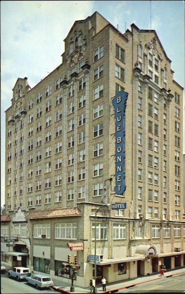 | Texas Sized Hospitality. In Romantic Old San Antonio The Fully Air-conditioned Blue Bonnet Hotel. Where St. Mary's and Pecan Streets meet. Free parking form registered guests, Coffee Shop, Room Service, Banquet Facilities, Valet Service, TV available, Drug Store, Barber Shop. Special Family rates. Al Barnhill, Manager. |