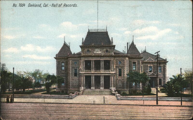Front: No. 1054 Oakland, Cal. -Hall of Records. Back: OAK 5 1 c. 2 c. Pacifie Novelty Co., Publ., San Francisco, Cal. No. 16 Made in Germany.