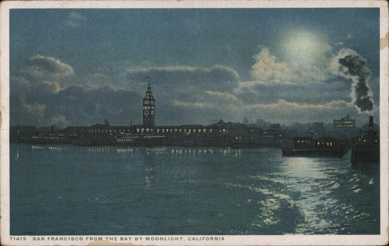 Front: 1915 00 71413 SAN FRANCISCO FROM THE BAY BY MOONLIGHT, CALIFORNIA Back: "PHOSTINT" TRADE MARK REG US PAT OFF MADE ONLY BY DETROIT PUBLISHING CO FOREIGN, TWO THIS SPACE MAY BE USED FOR MESSAGE. THIS SPACE FOR THE ADDRESS.