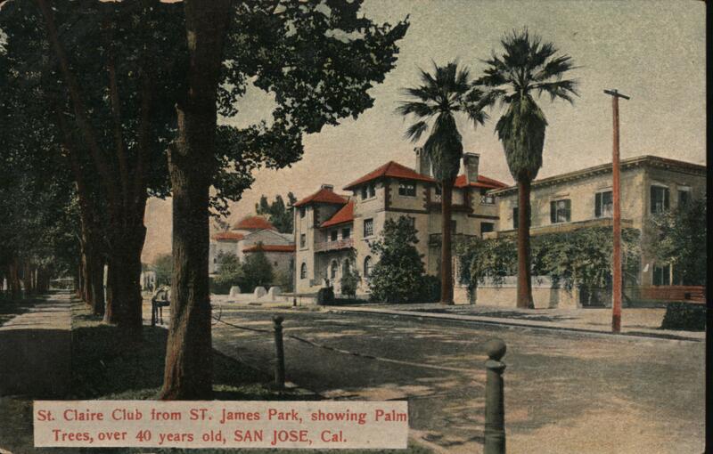 Front: St. Claire Club from ST. James Park, showing Palm Trees, over 40 years old, SAN JOSE, Cal. + Back: Write here. No. 5 Publ. by Newman Post Card Co., Los Angeles, Cal. (Made in Germany). From pap 1 ci M... Cuba 2 c