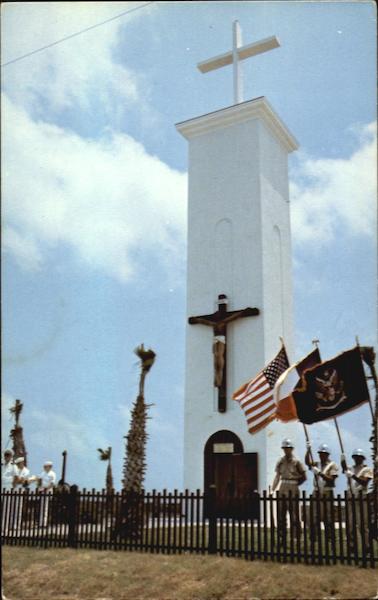 The Tower, paid for by public donations, was built on the harbor front to honor area seamen lost at Sea. Dedicated on May 9, 1970, the Tower is nearly 100 feet high . . . Including a 22-foot white cross, illuminated at night and visible for more than 10 miles at Sea. A feature of the structure is a 12-foot hand hewn statue of Christ sculptured from a piece of mahogany driftwood which came ashore on the beach of Port Aransas. The sculptor Raymond Veasey of Corpus Christi is a former Navy and merchant marine sailor. Inside the tiny chapel in the base of the Tower are plaques listing the lost seamen and those whose donations made the memorial possible. |