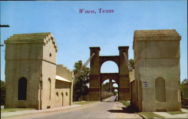 | The "Old Suspension Bridge" is built across the Brazos River in downtown Waco. Built in 1870, it still remains in daily use. It was the first bridge over the Brazos and made Waco an important center from East to West. It was built by Roebling of New York, who later patterned and built the Brooklyn Bridge after it. |