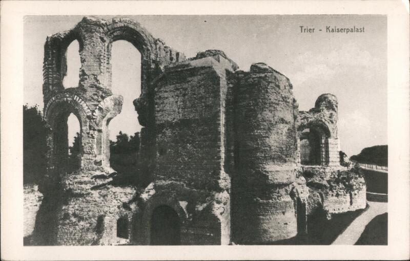 Front: Trier Kaiserpalast - Back: Trier or Treves. Oldest town in Germany. Founded 10 A.D. Ruins of Roman Emperors Palace. from Roman times of the middle ages.