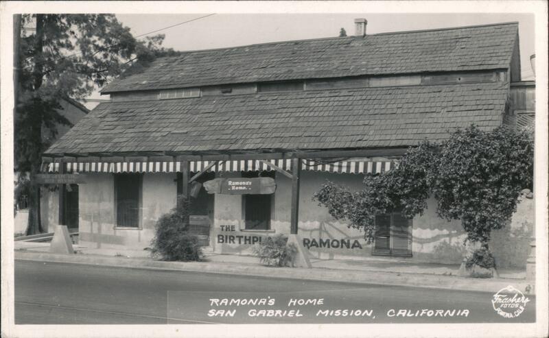 Front: OLD GRAPE VINE BEER GARDEN UKIT Ramona's -Home.. BIRTHPL RAMONA RAMONA'S HOME SAN GABRIEL MISSION, CALIFORNIA Frashers FOTOS POMONA.C Back: PUBLISHED BY FRASHERS, INC., POMONA, CALIF. Sept. wait L. 16. 194 1947 Eunic Roberts Long. Ett 12B-FR