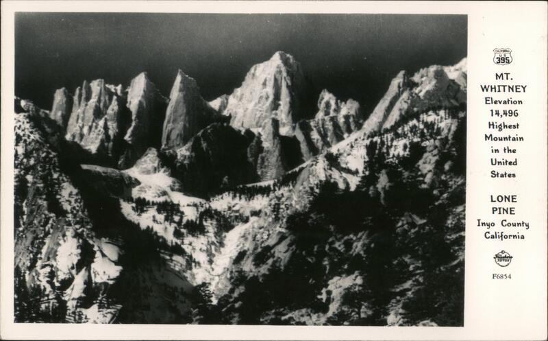 Front: CALIFORNIA US 395 MT. WHITNEY Elevation 14,496 Highest Mountain in the LONE PINE Inyo County California F6854 Back: 3A5-L ----- Puchers Foto Card Scenic Photos of the West PUBLISHED BY FRASHERS, INC. POMONA, CALIF.