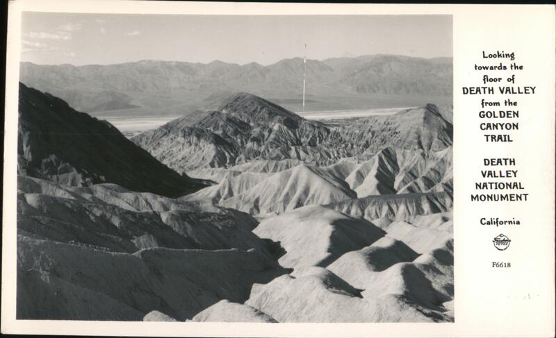 Front: Looking towards the floor of DEATH VALLEY from the GOLDEN CANYON TRAIL DEATH VALLEY NATIONAL MONUMENT California F6618 Back: Frashers Foto Card Scenic Photos of the West --EX- PUBLISHED BY FRASHERS INC POMONA, CALIF.