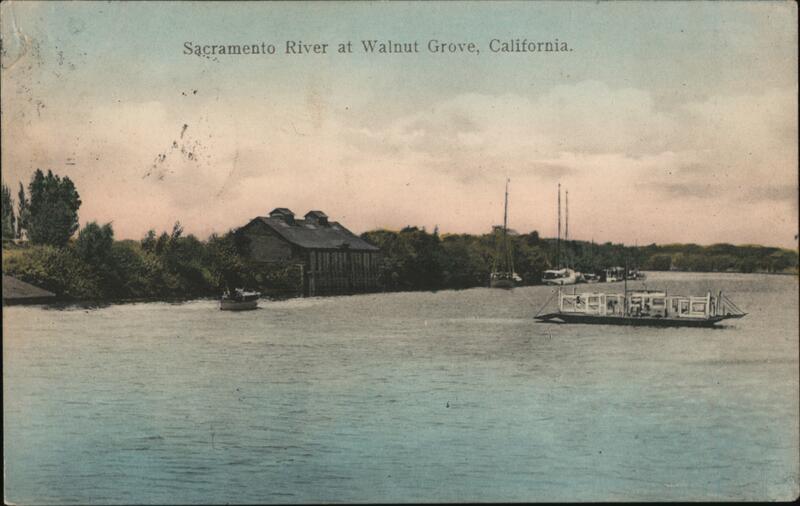 Front: Sacramento River at Walnut Grove, California. Back: TO GA UT WA SEN CAL 1 Mrs. M. R. Roester plear Mun. Hotase-have Yong to Isleton others afternoon Pitsbury tommow tallys the next day. Home Julsday Dad MA 552-1.23d et San Jose. Calif.