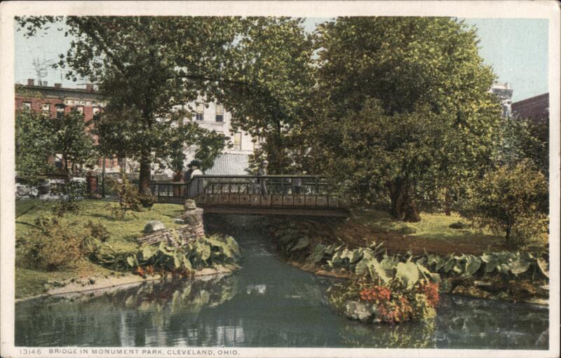 Front: EXCEL 13146 BRIDGE IN MONUMENT PARK, CLEVELAND, OHIO. Back: "PHOSTINT" CARD. TRADE MARK - REG. U. S. PAT. OFF. MADE ONLY BY DETROIT PUBLISHING CO. THIS SPACE MAY BE USED FOR MESSAGE. 3- AND CANADA. FOREIGN. TWC CENTS