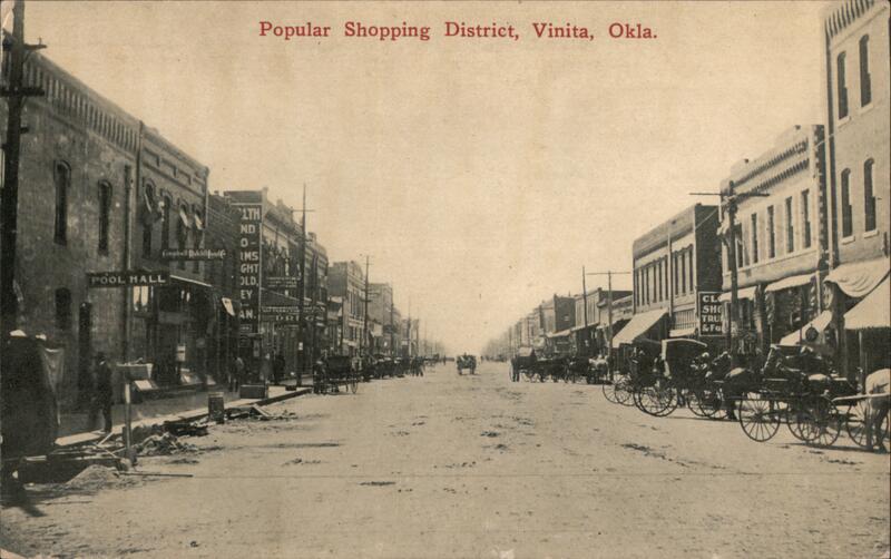 Front: LTH ND 0- Compbell Reifend IMS GHT POOL HALL OLD EY AN. Popular Shopping District, Vinita, Okla. CLO SHO TRU & Fu Back: 21145 PUB. BY CHEROKEE BARGAIN STORE, VINITA, OKLA. Domestic and Two Cents