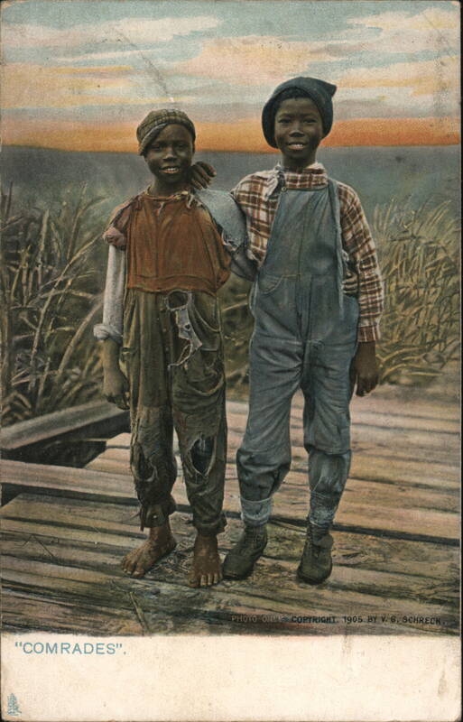 Front: "COMRADES". PHOTO ONLY COPYRIGHT 1905 BY V. G. SCHRECK Back: ND QUEEN, The Sunny South. Photochromed in Saxony By App th ال TUCK'S POSTCAR 36 TL 96 Vis homs - not very cold but Lots of rain dan a.L.C SERIES 1902 NITED STATES