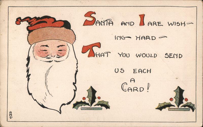 Front: SANTA ANTA AND 1 ARE ARE WISH- ING HARD - SHAT YOU WOULD SEND 05 EACH CARD! Back: AMERICAN RED CROSS LL AJORN Lon 1008 Love & Merry Christmas Happar itton LONDON. Mrs Catherine Mallow Vicksburg Greetings to all Michigan Margare