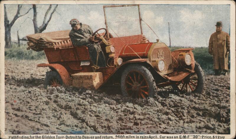 Pathfinding for the Glidden Tour-Detroit to Denver and return. 2600 miles in rainvApril. Car was an E-M-F "30"-Price, $1260