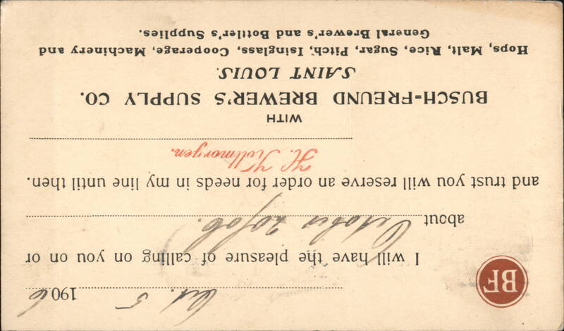 An advertising card for Busch-Freund Brewers Supply Co. The front of the card has a list of their products: Hops, Malt, Rice's Supplies, Cooperage Machinery and Isinglass, Pitch, Sugar, Bottles and General Brewer's Supplies. The back of the card is a standard divided back postcard design with a pre-printed message that reads 'With the Compliments of BUSCH-FREUND BREWERS' SUPPLY CO. Saint Louis' and space for a short message. |