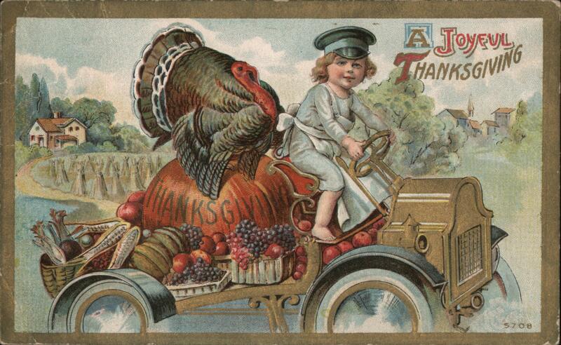 | A Joyful Thanksgiving postcard, No. 5708, with a boy in a chauffeur's hat driving an automobile with a large pumpkin, a turkey, and a cornucopia of fruits and vegetables. "Dear friend Edith: ... I will send you this card as I promised. How are you all? How is Ethel? ... How does Ethel like school?" |