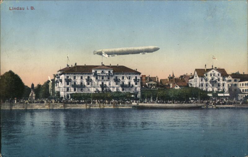 Postcard view of Lindau, Germany. The Hotel Bayerischerhof and a Zeppelin airship are featured.