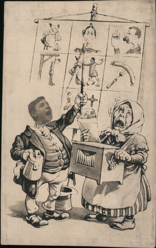 Comic postcard featuring a male and female street musician performing for a crowd. The man is cranking a hurdy-gurdy and the woman is holding a sign showing various humorous scenes, likely depicting their act.