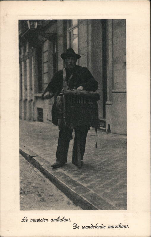 Real photo postcard of a street musician with a crank-organ in France. The French and Dutch text at the bottom of the postcard says 'The Itinerant Musician'.