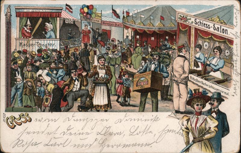 | Antique German postcard with a illustration of a busy carnival midway with a variety of attractions, including a Kasper Theater puppet show, a shooting gallery (Schiess-Salon), a Grosser-Ball, a man with an organ grinder and crowds of people. The postcard is postmarked from Schreibershau, Germany, on August 8, 1921. |