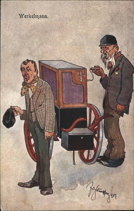 Artist Signed (F. Schonlaufer Jr.) comic postcard illustration of an organ grinder with his monkey and a man dropping a coin in for a song.