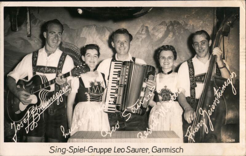 | Black and white real photo postcard of Sing-Spiel-Gruppe Leo Sauer, Garmisch. The band consists of 3 men and 2 women, all wearing traditional Bavarian clothing. The men are playing guitar, accordion, and bass, while the women are singing. |