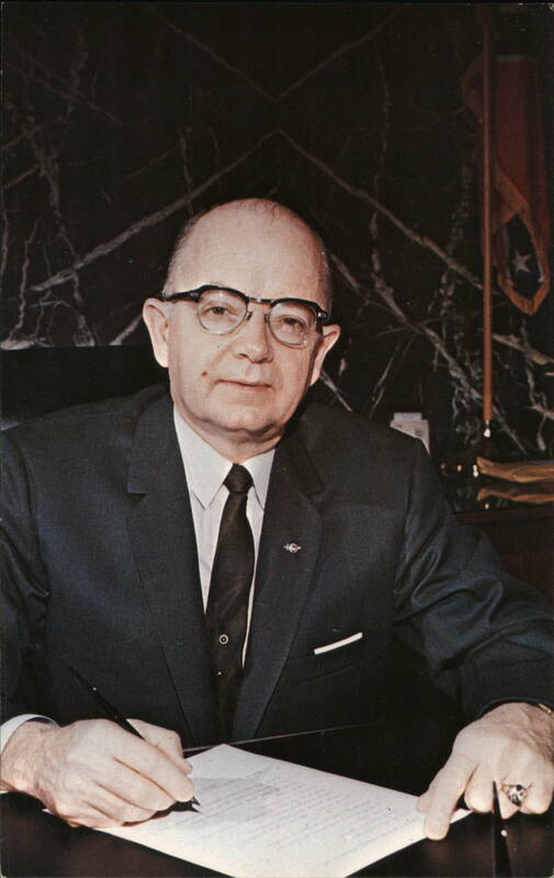 A portrait of Lester Maddox, Governor of GA, sitting at his desk and signing a document.