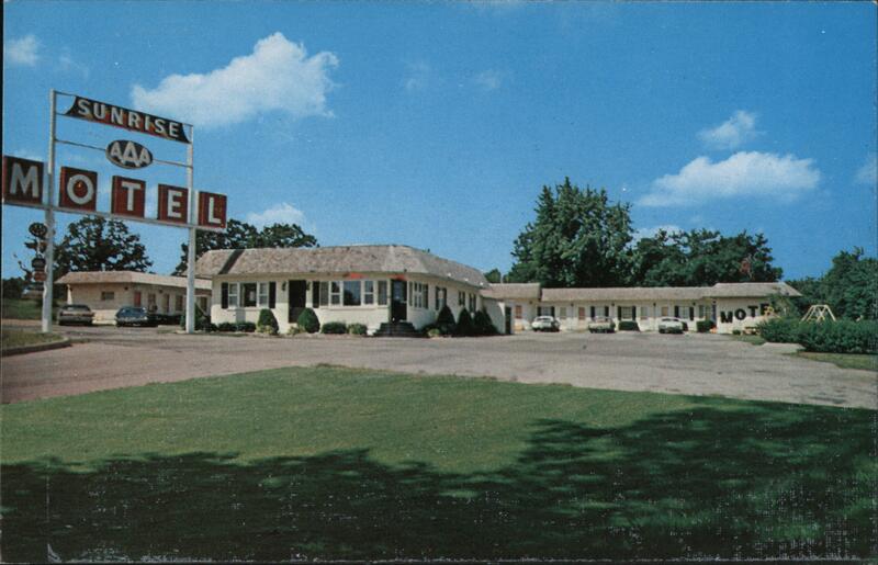 | An image of the Sunrise Motel in Sullivan. The back lists amenities: 66 miles west of St. Louis, on I-44 and 185 North, Carpet - Television - all comforts, family units. Nearby points of interest - Meramec Caverns, Meramec State Park, Onondaga Cave, and 30 minutes from Six Flags over Mid-America. |