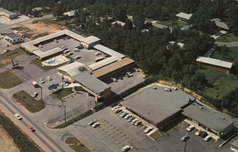 | An aerial view of the Ambassador Motel, Restaurant & Convention Room. The back of the postcard provides the following details: 70 rooms - Telephones - Air Conditioned - TV - Swimming Pool. It also notes it's location as 3 miles north on Interstate 75 - Pierce Avenue Exit. Adjacent to Riverside Shopping Center. 2772 Riverside Dr., Macon, Georgia. Phone 742-3687 |