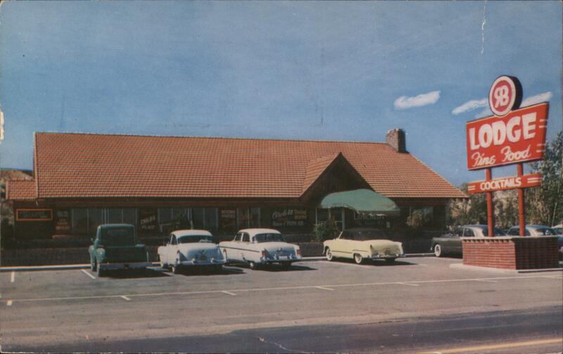 | An antique postcard featuring a color photo of the Circle RB Lodge on W. Fourth Street, a dining establishment known for its prime rib, cocktails, and "Reno's House of Prime Rib." The handwritten message indicates pleasant weather and a fun time. |