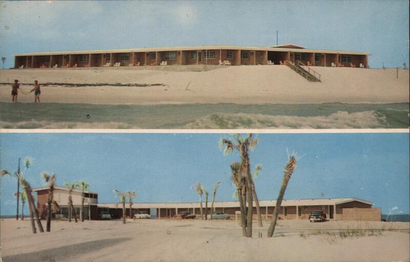 | This is a two-view postcard of the Treasure Island Motel. The top view shows the back of the motel from the beach, with people on the beach. The bottom view shows the front of the motel from the street. There are palm trees in front of the motel and cars parked in the lot. The handwritten message indicates the card was sent to someone who was once stationed at nearby Tyndall AFB. |