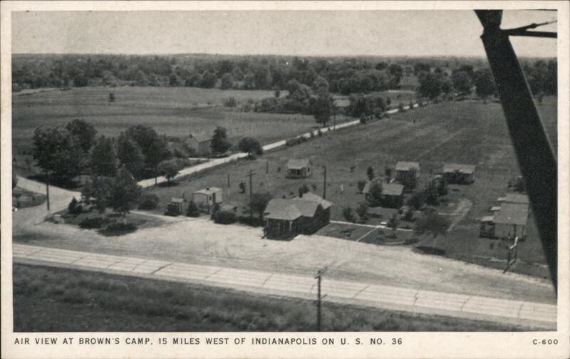 Front: AIR VIEW AT BROWN'S CAMP, 15 MILES WEST OF INDIANAPOLIS ON U. S. NO. 36 C-600 Back: GLOSS TONE MFD. BY FORT WAYNE PRINTING CO., FORT WAYNE, IND. HERE