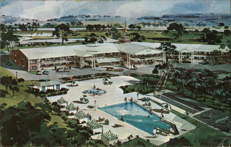 This is a color postcard depicting an artist's rendering of the Westport New Englander Motor Hotel. The postcard lists amenities such as 76 rooms and suites, air conditioning, soundproof, TV, radio, putting green, swimming pool, cabana club, sun decks. The back of the card has a handwritten message which reads: Dear Folks To made it! The Children loved their first jet flight, and we are half course listening to Doris Day. The gas is like 32/gal. so its a rush. Hope to have the Children see New York City Thursday. Love Pat |