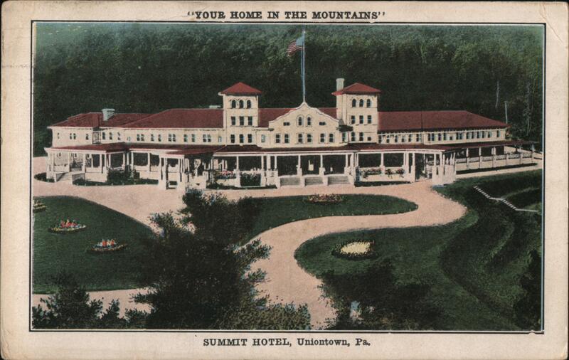 An idyllic view of the Summit Hotel in Uniontown. The large hotel features an expansive covered porch. A long driveway curves around a well-maintained lawn with flowerbeds. The handwritten message on the back states: Leaving for home in the morning at 11:15 - Had a fine time - Wish you were here - Yours - Mrs. Finch" |