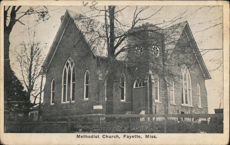 | Methodist Church in Fayette. The back of the card has a handwritten message that reads: "Come see us - We hope fully with us while we are at ... folks gone crazy. If we look for them about 26 - we will spend a few days with us recuperating Love + Best wishes" |