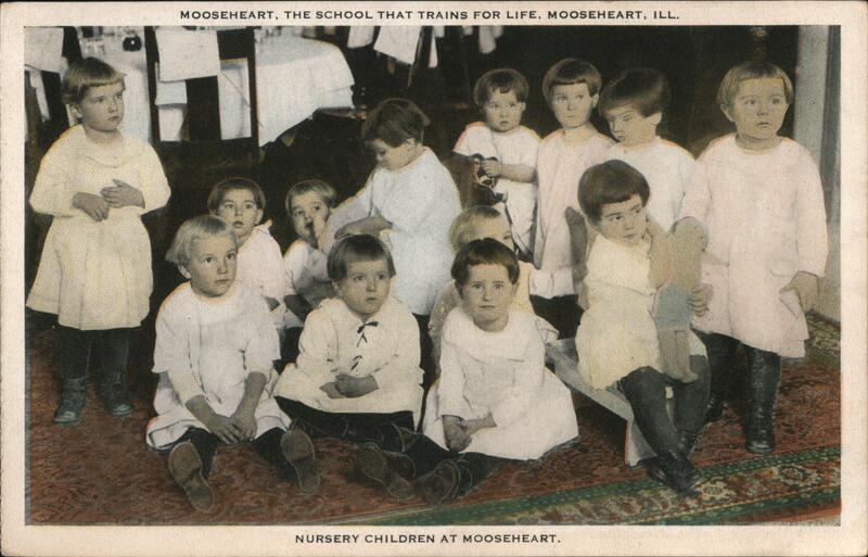 A group of young children, dressed in their Sunday best, pose for a photo at Mooseheart. The boys are wearing sailor suits and the girls are dressed in white. Some of the children are holding dolls. The back of the card describes Mooseheart as an estate consisting of one thousand and twenty-three acres, situated on the Lincoln Highway between Aurora, Illinois and Batavia, Illinois. It is maintained by the Supreme Lodge of the World, Loyal Order of Moose and is a Home and School that trains for life, the dependent children of deceased members of the Order. |