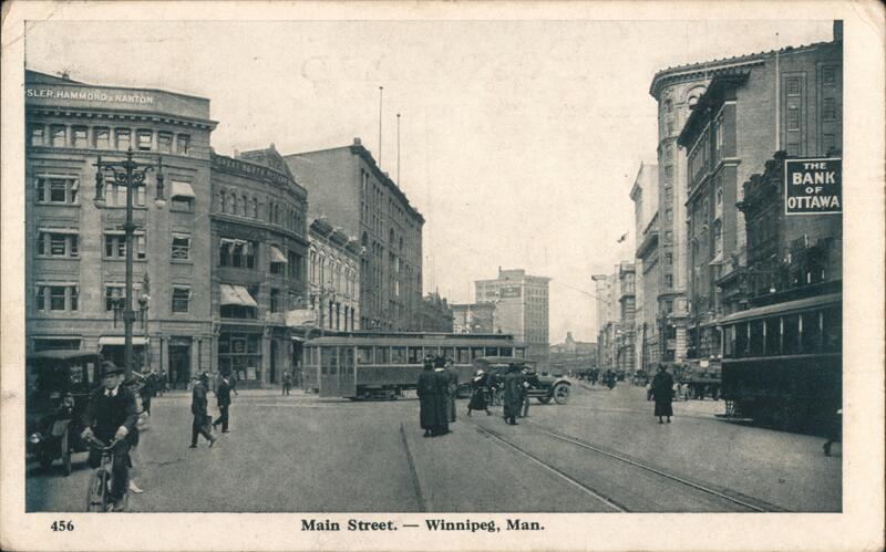 | A view of Main Street in Winnipeg, Manitoba. The street is busy with pedestrians, automobiles, and electric trolleys. A sign in the distance reads: "Great West Permanent." The Bank of Ottawa is pictured on the right. The sender mentions that it is quite cold and windy, but otherwise the weather has been pleasant. They are enjoying Winnipeg, but looking forward to visiting the recipient soon. |