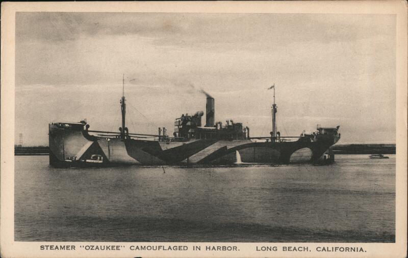 Front: STEAMER "OZAUKEE CAMOUFLAGED IN HARBOR. LONG BEACH, CALIFORNIA. Back: HECHTS PLATINO 335 19777 Julius J. Hecht, Publisher, Los Angeles, California
