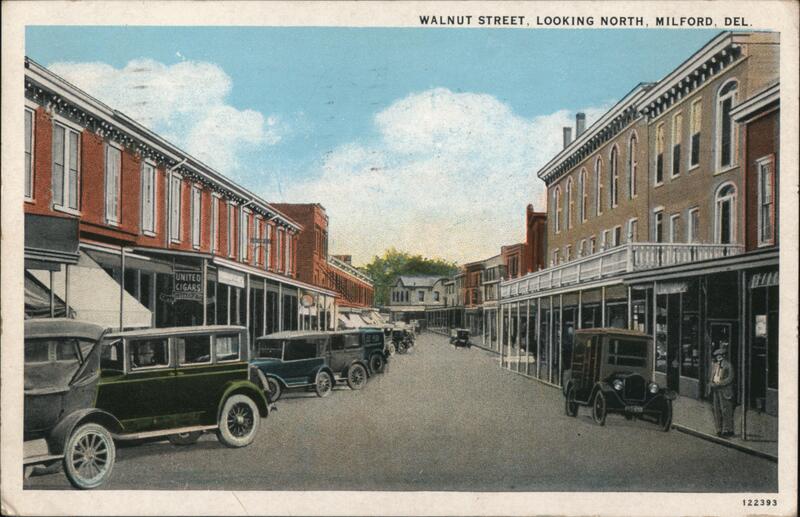 | Walnut Street, looking north in Milford, Delaware. This view of Walnut Street shows cars lining both sides of the street. Businesses and shops line both sides of the street. There is a handwirtten message on the back that reads, "Dear Edna, Just a card to let you know we are in the best city in the U.S. Bes Regards, Louise." |