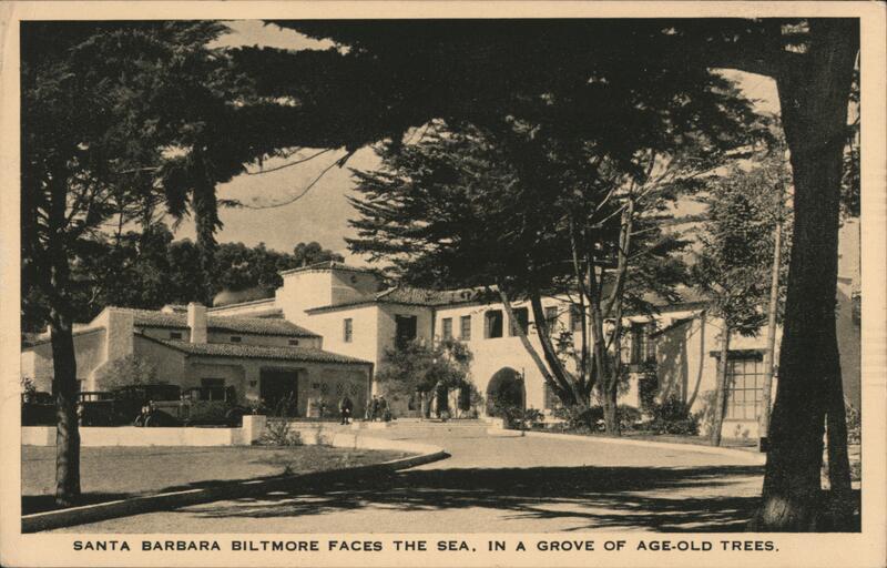 This vintage postcard features a view of the Santa Barbara Biltmore hotel. The hotel is framed by a grove of tall trees. Several vintage automobiles are parked near the hotel entrance.