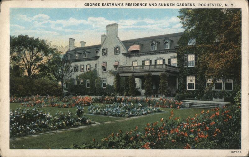 Front: GEORGE EASTMAN'S RESIDENCE AND SUNKEN GARDENS, ROCHESTER, N. Y. 000 107038 Back: PUBLISHED BY WM. JUBB CO., INC., SYRACUSE, N. V. C. T. AMERICAN ART COLORED Goo INC HERE