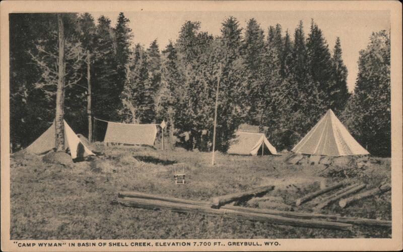 Front: "CAMP WYMAN" IN BASIN OF SHELL CREEK, ELEVATION 7,700 FT., GREYBULL, WYO. Back: PUBLISHED BY MYRT KOWALSKY, OAKLAND, CAL. RD-10428 C.T DOUBLET ONE ران 5- CENTS2 THIS SPACE FOR ADDRESS ONLY.
