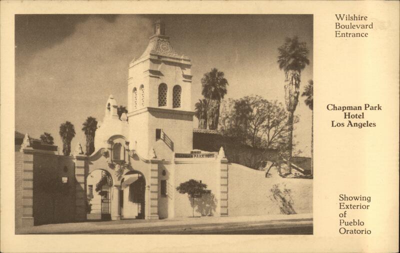 ARMAN PARK HOTEL Wilshire Boulevard Entrance Chapman Park Los Angeles Showing Exterior of Pueblo Oratorio