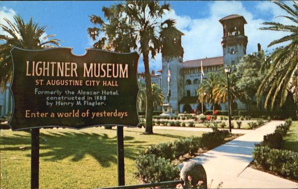 | St. Augustine City Hall Formerly the Alcazar Hotel, constructed in 1888 by Henry M. Flagler. Enter a world of yesterdays. Lightner Museum, housed in yesteryear's elegant Alcazar Hotel and bequeathed to the City by Otto C. Lightner, features "A World of Yesterdays". The Museum, located on King Street, St. Augustine, Florida, is open daily. |