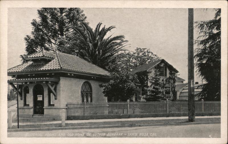 A view of the editorial rooms and old home of Luther Burbank. The back of the card has a handwritten message that reads: "Luther Burbank, the great horticulturist, developed in his experimental gardens the white blackberry, the chulta daisy, the spineless cactus, the red California poppy, the stoneless prune, &c." |