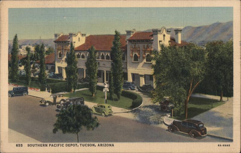 A view of the Southern Pacific Depot in Tucson, Arizona. Cars are parked in front of the depot. The message on the back reads: Dear Folks- Well here it is Monday and I haven't heard from you since Saturday. I'm not worried but hope you are O.K. This is sure a wonderful place. Love "Boots" |