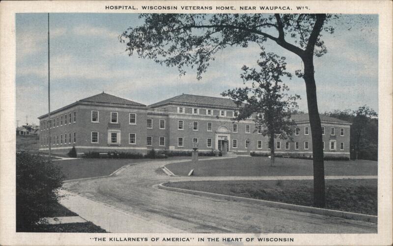| A view of the Wisconsin Veterans Home, a large brick building with many windows. The postcard states that this is near Waupaca, WI. This is nicknamed "The Killarneys of America" in the heart of Wisconsin. The back has a divided back and an advertisement for Industry-Agriculture and a 1 cent stamp. A message to Mr. & Mrs. Hudson of 318 N. Randall in Madison, Wis. states "Well here is a picture of where I am, pretty swell isn't it and we don't do a thing but eat, sleep and rest. We are going to be fat as pigs when we get home." |