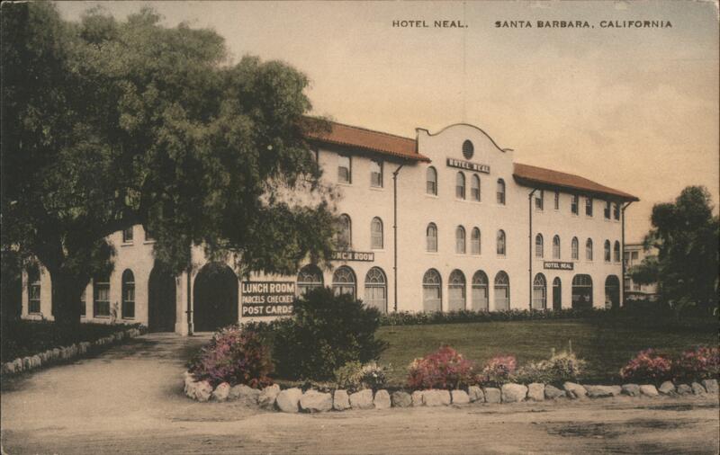| Hotel Neal in Santa Barbara, California. The hotel is a white, two-story building. There is a sign in front that reads, "LUNCH ROOM PARCELS CHECKED POST CARDS." There is a large tree on the left side of the image, a lawn in front and landscaping with flowers and rocks. |