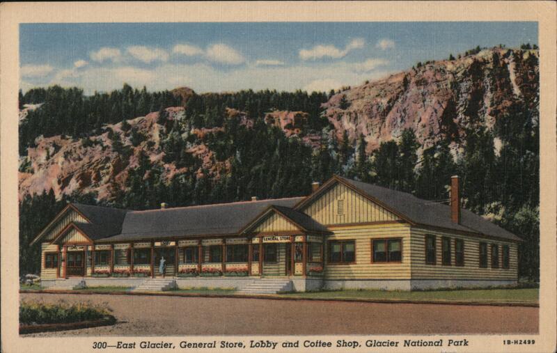 Front: GENERAL STORE LOBBY COFFEE SHOP 300-East Glacier, General Store, Lobby and Coffee Shop, Glacier National Park 1B-H2499 Back: GLACIER PARK CO. "C.T.ART-COLORTONE REG. U.S. PAT. OFF. PLACE